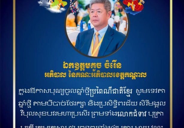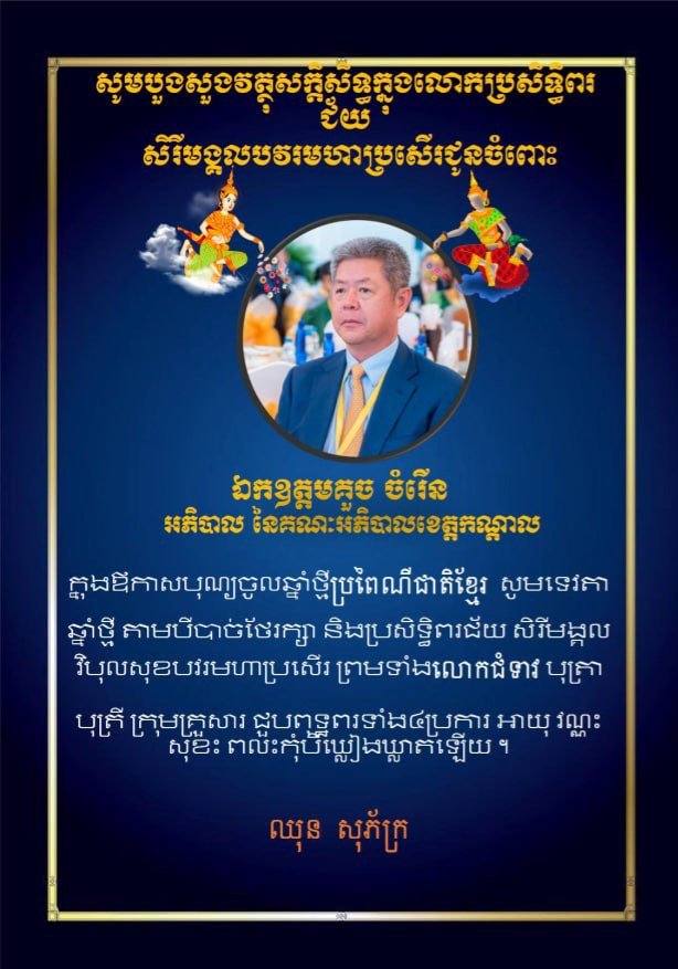 ក្នុងឱកាសចូលឆ្នាំថ្មីឆ្នាំប្រពៃណីជាតិខ្មែរ២០២៥ សូមឯកឧត្តមទទួលបាននូវសេចក្តីសុខភាពបរិបូណ៌ប្រាជ្ញាឈ្លាសវៃ អាយុយឺនយូរដើម្បីបន្តចូលរួមកសាង និងអភិវឌ្ឍន៍មាតុភូមិឲ្យកាន់តែរីកចម្រើនថ្កុំផ្កើងថែមទៀត ។