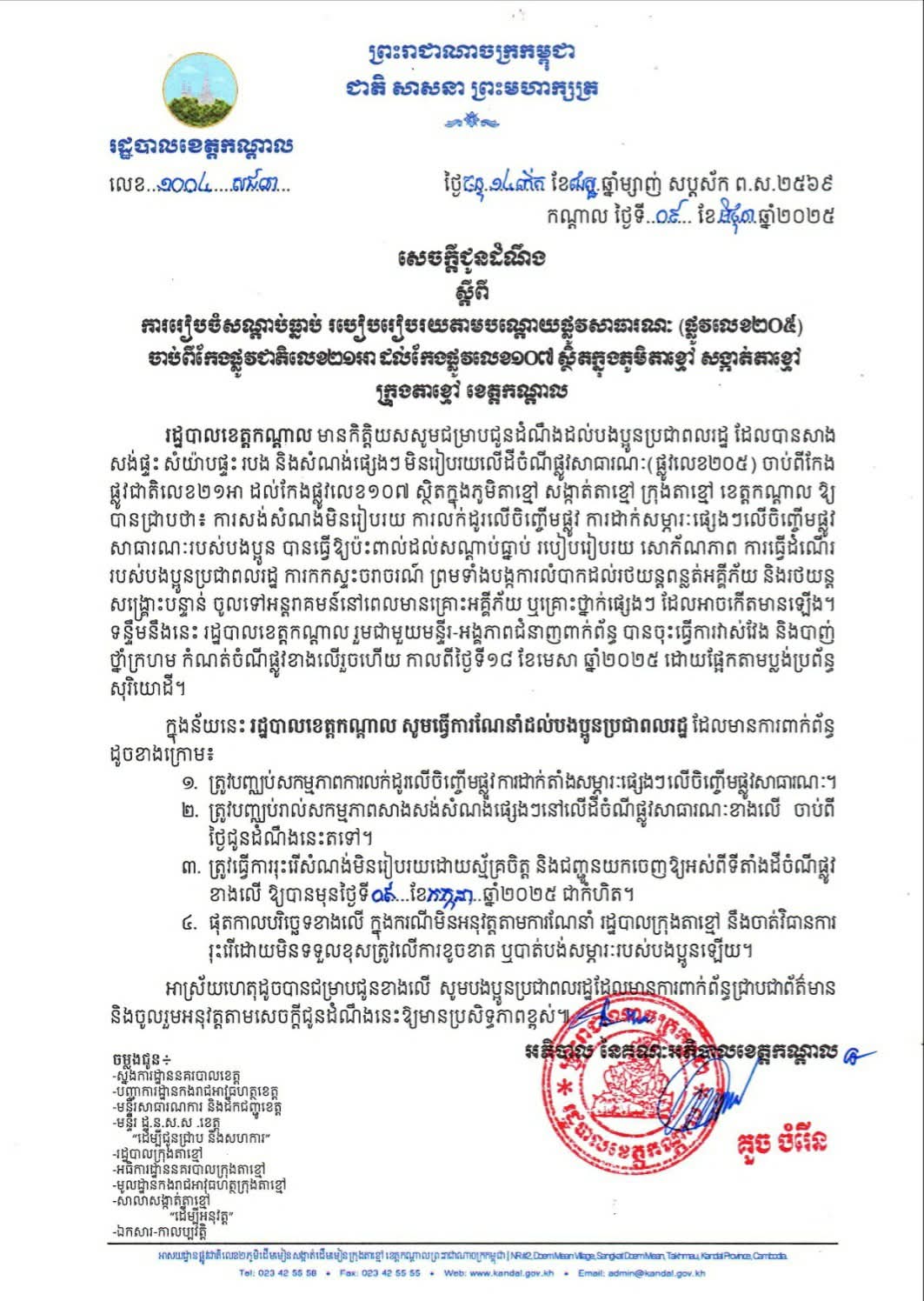 កណ្តាល៖ ប្រជាពលរដ្ឋក្នុងភូមិ-សង្កាត់តាខ្មៅ ក្រុងតាខ្មៅបានគាំទ្រ និងយល់ព្រមសហការជាមួយអាជ្ញាធរ ក្នុងការរៀបចំសណ្តាប់ធ្នាប់របៀបរៀបរយតាមបណ្តោយ ផ្លូវសាធារណៈ (ផ្លូវលេខ២០៥)ចាប់ពីកែងផ្លូវជាតិលេខ ២១អា ដល់កែងផ្លូវលេខ១០៧ ។ ការគាំទ្រនេះ បានធ្វើឡើងនៅក្នុងកិច្ចប្រជុំ ផ្សព្វផ្សាយសេចក្តីជូនដំណឹង លេខ១០០៤ ស.ជ.ណ ចុះថ្ងៃទី៩ ខែមិថុនា ឆ្នាំ២០២៥ របស់រដ្ឋបាលខេត្តកណ្ដាល ស្តីពីការរៀបចំសណ្តាប់ធ្នាប់ របៀបរៀបរយតាមបណ្តោយផ្លូវសាធារណៈ (ផ្លូវលេខ ២០៥) ចាប់ពីកែងផ្លូវជាតិលេខ២១អា ដល់កែងផ្លូវលេខ ១០៧ ស្ថិតក្នុងភូមិតាខ្មៅ សង្កាត់តាខ្មៅ ក្រុងតាខ្មៅ ដែលបានដឹកនាំកិច្ចប្រជុំដោយ ឯកឧត្តម ណុប ដារ៉ា អភិបាលរងខេត្តកណ្តាល នាព្រឹកថ្ងៃទី១ ខែកក្កដា ឆ្នាំ ២០២៥ នៅសាលប្រជុំសាលាខេត្តកណ្ដាល។