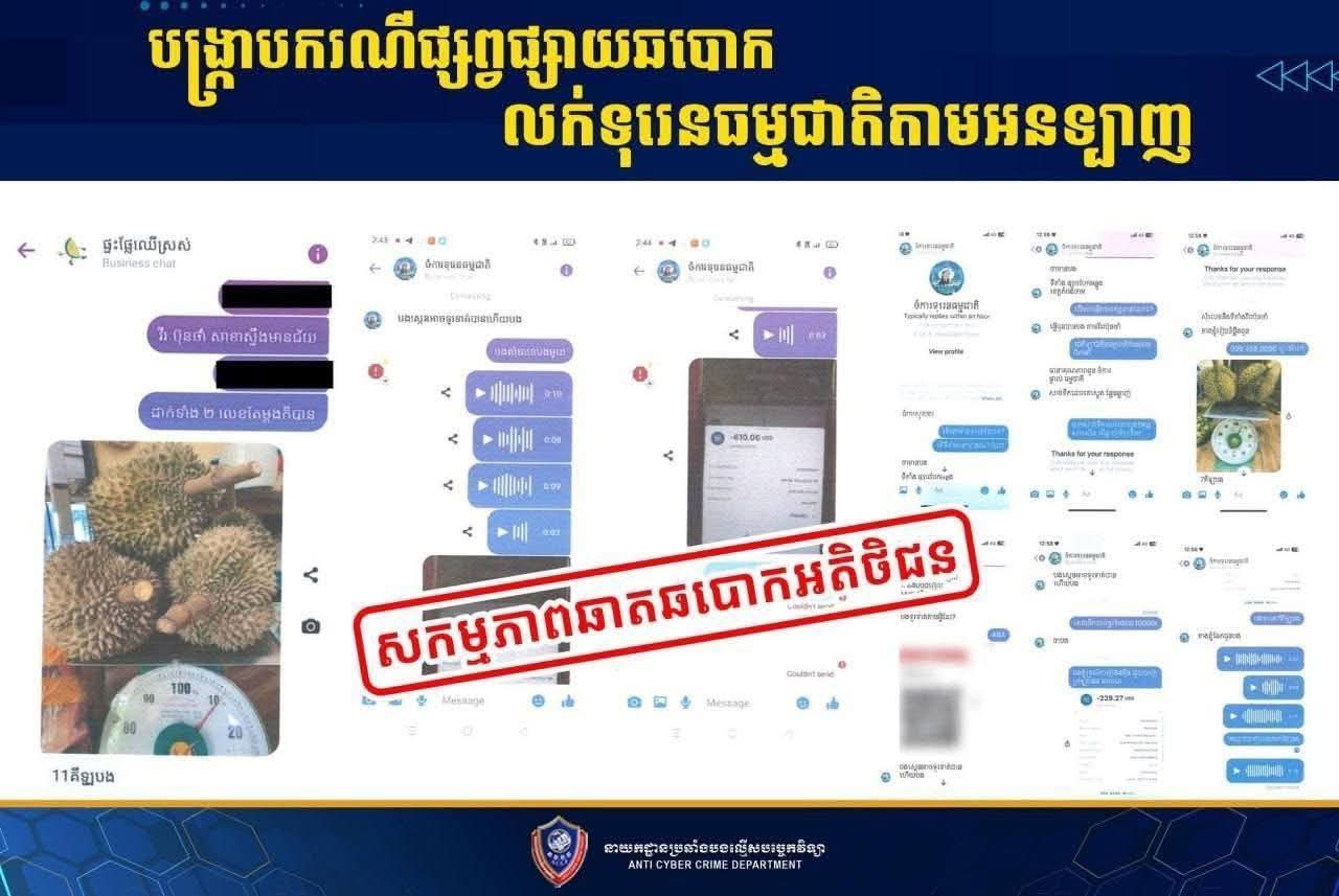 ភ្នំពេញ៖ យោងតាមបញ្ជាដឹកនាំរបស់ ឯកឧត្ដម នាយឧត្ដមសេនីយ៍ ស ថេត អគ្គស្នងការនគរបាលជាតិ និងតាមការចង្អុលណែនាំពី ឯកឧត្ដម ឧត្ដមសេនីយ៍ឯក អគ្គស្នងការរងនគរបាលជាតិ កាលពីថ្ងៃទី០១ ខែកក្កដា ឆ្នាំ២០២៥ នាយកដ្ឋានប្រឆាំងបទល្មើសបច្ចេកវិទ្យា បានបើកការស្រាវជ្រាវ ករណីឆបោកប្រាក់ផ្សព្វផ្សាយទិញ-លក់ផ្លែទុរេន តាមបណ្ដាញទំនាក់ទំនងសង្គម។