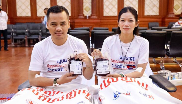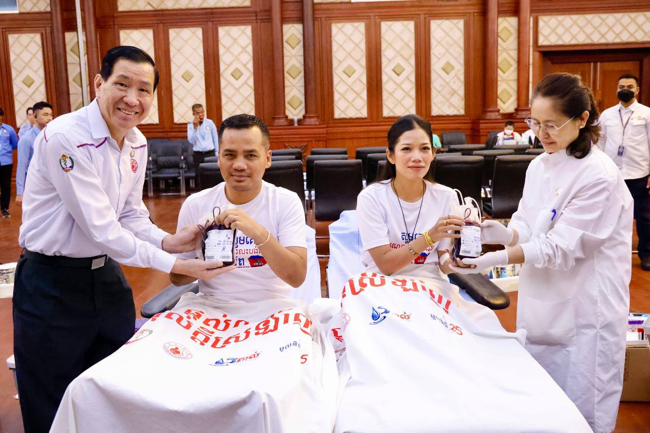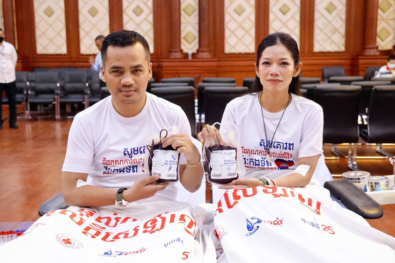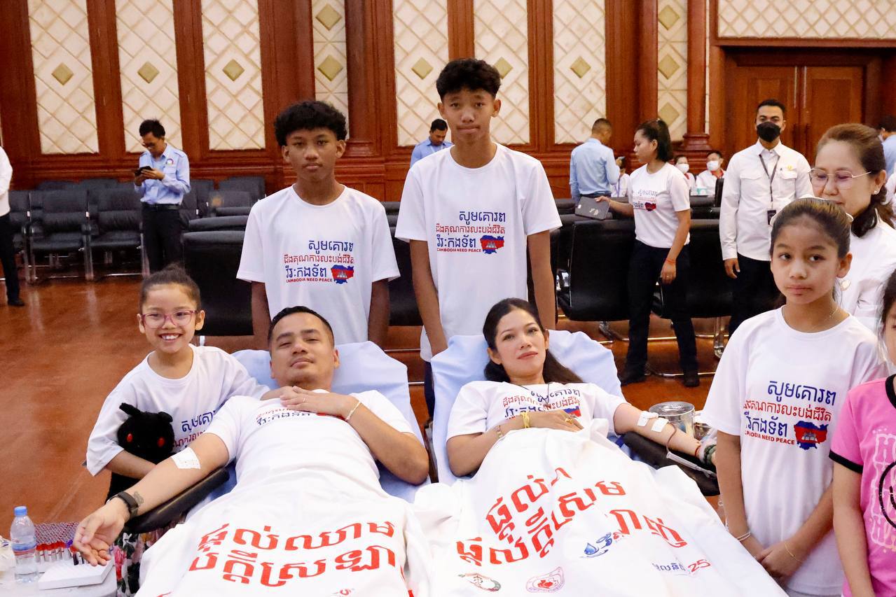 ពិធីបរិច្ចាគឈាមគាំទ្រកម្លាំងជួបមុខ ទាំងកម្លាំងកងយោធពលខេមរភូមិន្ទ និងកម្លាំងនគរបាលការពារព្រំដែន ដែលបានកំពុងអនុវត្តបទបញ្ជាការពារអធិបតេយ្យភាពជាតិ និងបូណភាពទឹកដី ប្រកបដោយភាពអង់អាចច្បាស់លាស់ សម្ដេចធិបតីនាយករដ្ឋមន្ត្រី នៃកម្ពុជា បានធ្វើឡើងនៅទីស្ដីការក្រសួងមហាផ្ទៃ ក្រោមការសម្របសម្រួលពីសហភាពសហព័ន្ធយុវជនកម្ពុជា (ស.ស.យ.ក ) វិស័យមហាផ្ទៃ និងកិច្ចសហការគាំទ្រពីក្រសួងសុខាភិបាល។