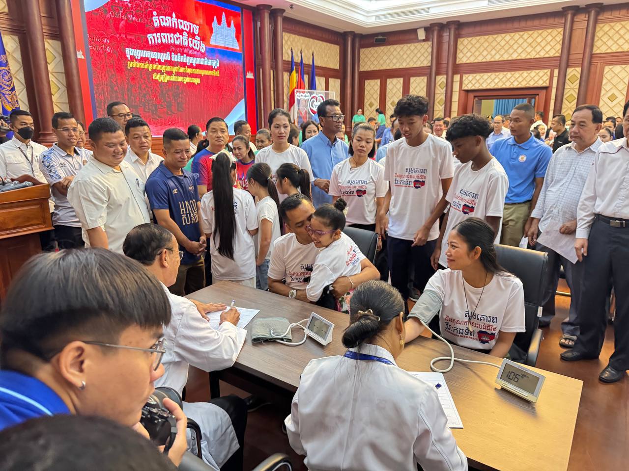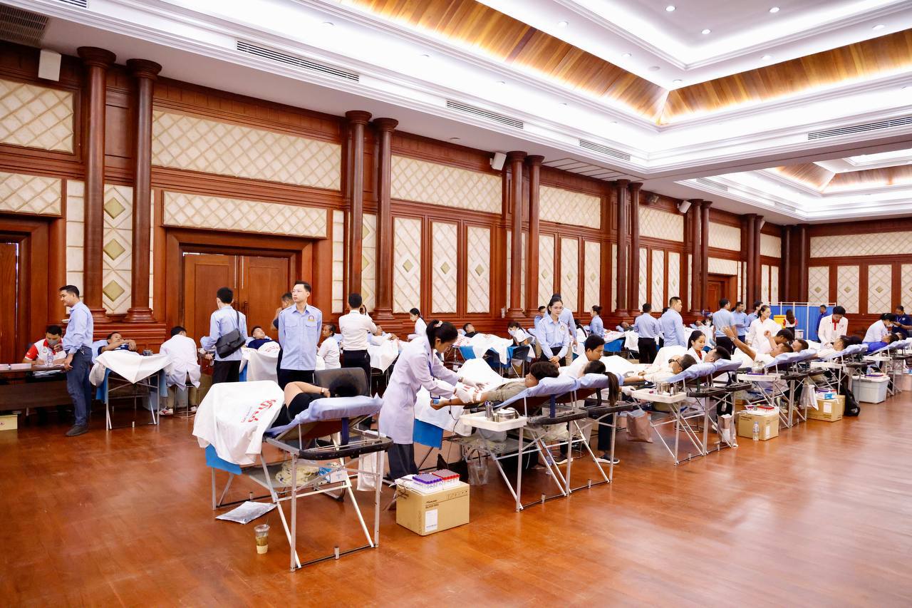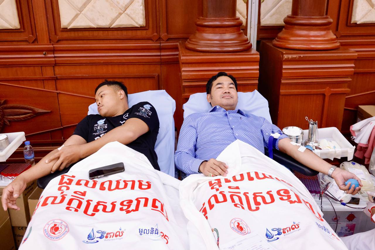 ពិធីបរិច្ចាគឈាមគាំទ្រកម្លាំងជួបមុខ ទាំងកម្លាំងកងយោធពលខេមរភូមិន្ទ និងកម្លាំងនគរបាលការពារព្រំដែន ដែលបានកំពុងអនុវត្តបទបញ្ជាការពារអធិបតេយ្យភាពជាតិ និងបូណភាពទឹកដី ប្រកបដោយភាពអង់អាចច្បាស់លាស់ សម្ដេចធិបតីនាយករដ្ឋមន្ត្រី នៃកម្ពុជា បានធ្វើឡើងនៅទីស្ដីការក្រសួងមហាផ្ទៃ ក្រោមការសម្របសម្រួលពីសហភាពសហព័ន្ធយុវជនកម្ពុជា (ស.ស.យ.ក ) វិស័យមហាផ្ទៃ និងកិច្ចសហការគាំទ្រពីក្រសួងសុខាភិបាល។