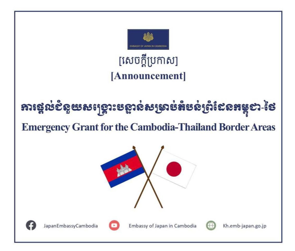 ឯកអគ្គរាជទូតជប៉ុនប្រចាំនៅកម្ពុជា ឯកឧត្តម អ៊ូអិណុ បានបង្ហោះតាមផេកផ្លូវការរបស់ស្ថានទូតជប៉ុនប្រចាំនៅកម្ពុជា នាព្រឹកថ្ងៃទី១៥ ខែសីហា ឆ្នាំ២០២៥ បានលើកឡើងថា រដ្ឋាភិបាលជប៉ុនបានសម្រេចផ្តល់ជំនួយសង្គ្រោះបន្ទាន់(ឥតសំណង)ដែលមានទឹកប្រាក់សរុបប្រមាណ ១,៨ លានដុល្លារអាមេរិក ដើម្បីឆ្លើយតបទៅនឹងតម្រូវការមនុស្សធម៌ជាបន្ទាន់នៅតាមតំបន់ព្រំដែនកម្ពុជា-ថៃ។
