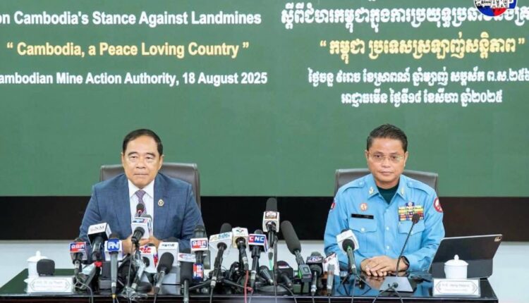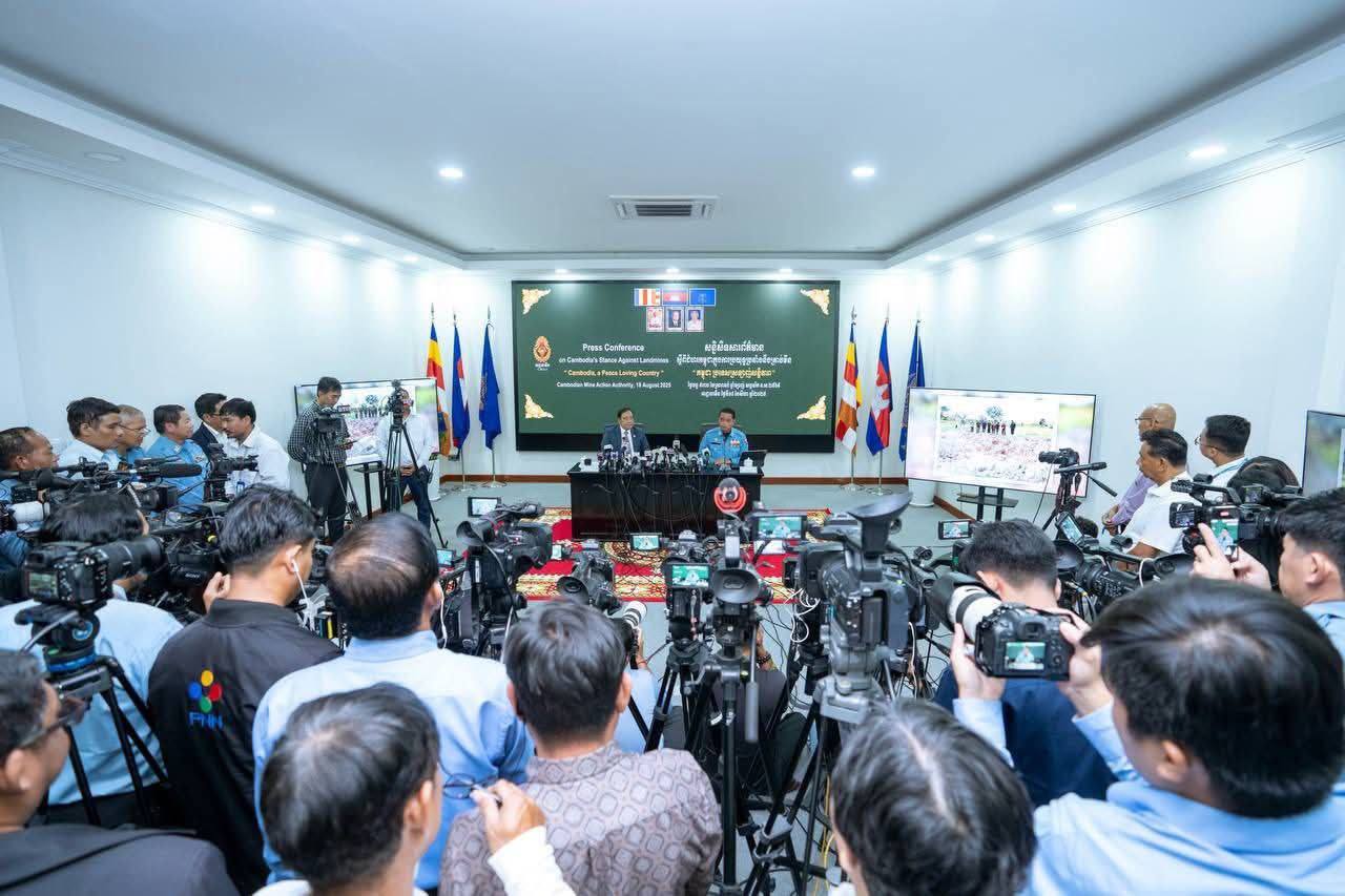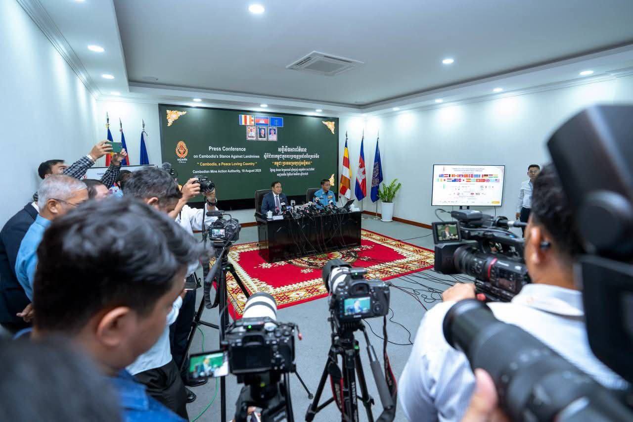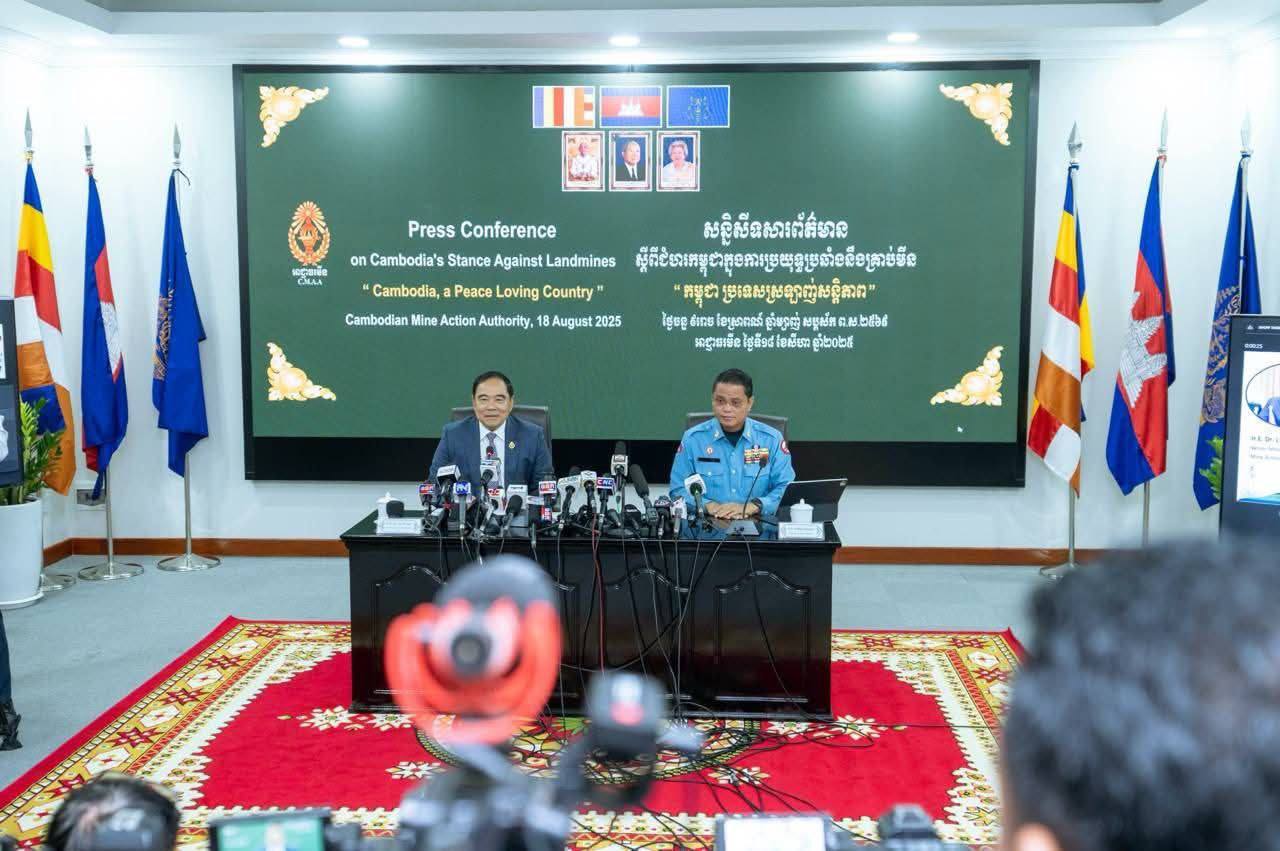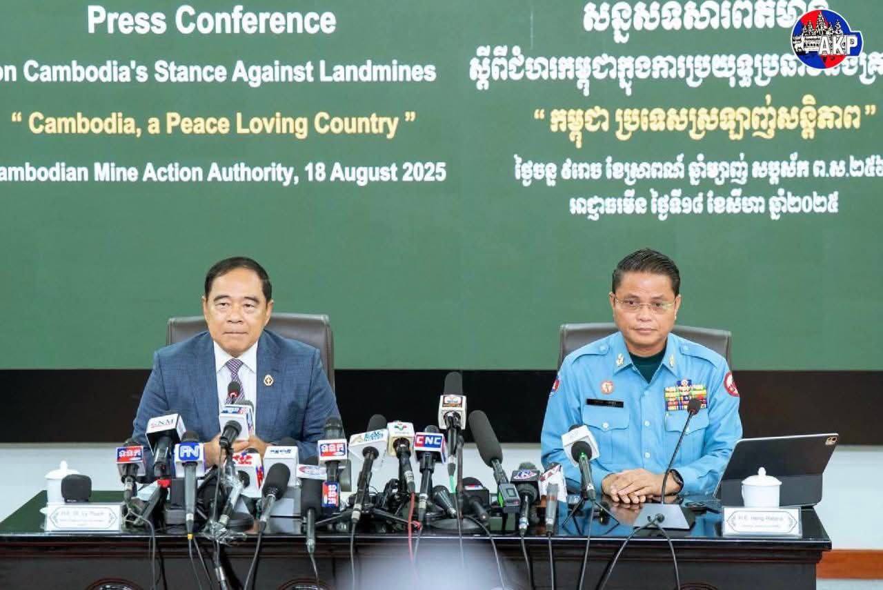 ភ្នំពេញ ថ្ងៃទី១៨ ខែសីហា ឆ្នាំ២០២៥ ឯកឧត្តមបណ្ឌិត លី ធុជ ទេសរដ្ឋមន្ត្រី និងជាអនុប្រធានទី១ អាជ្ញារមីន និងឯកឧត្តម ហេង រតនា ប្រតិភូរាជរដ្ឋាភិបាល ទទួលបន្ទុកជាអគ្គនាយក នៃមជ្ឈមណ្ឌលសកម្មភាពកំចាត់មីនកម្ពុជា (ស៊ីម៉ាក់-CMAC) អញ្ជើញជាអធិបតីសន្និសីទសារព័ត៌មាន ស្តីពីជំហរកម្ពុជាក្នុងការប្រយុទ្ធប្រឆាំងគ្រាប់មីន ក្រោមប្រធានបទ “កម្ពុជា ប្រទេសស្រលាញ់សន្តិភាព” ដែលរៀបចំនៅទីស្នាក់ការអាជ្ញាធរមីន រាជធានីភ្នំពេញ នាព្រឹកថ្ងៃទី១៨ ខែសីហា ឆ្នាំ២០២៥។