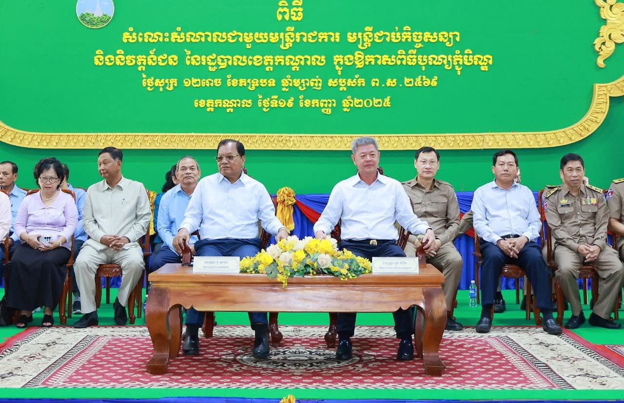កណ្តាល៖ ឯកឧត្តម នូ សាខន ប្រធានក្រុមប្រឹក្សាខេត្ត និង ឯកឧត្តម គួច ចំរើន អភិបាល នៃគណៈអភិបាលខេត្តកណ្តាល នៅព្រឹកថ្ងៃទី១៩ ខែកញ្ញា ឆ្នាំ២០២៥នេះ បានជួបសំណេះសំណាល ជាមួយមន្ត្រីរាជការ មន្ត្រីជាប់កិច្ចសន្យា និងមន្ត្រីចូលនិវត្តន៍ នៃរដ្ឋបាលខេត្តកណ្ដាល ក្នុងឱកាសពិធីបុណ្យភ្ជុំបិណ្ឌ ដោយមានការអញ្ជើញចូលរួមពី ឯកឧត្តម លោកជំទាវ សមាជិកក្រុមប្រឹក្សាខេត្ត អភិបាលរងខេត្ត លោក លោកស្រីនាយក នាយករងទីចាត់ការ និងអង្គភាពចំណុះសាលាខេត្ត ប្រមាណជាង ៥០៥នាក់ ។