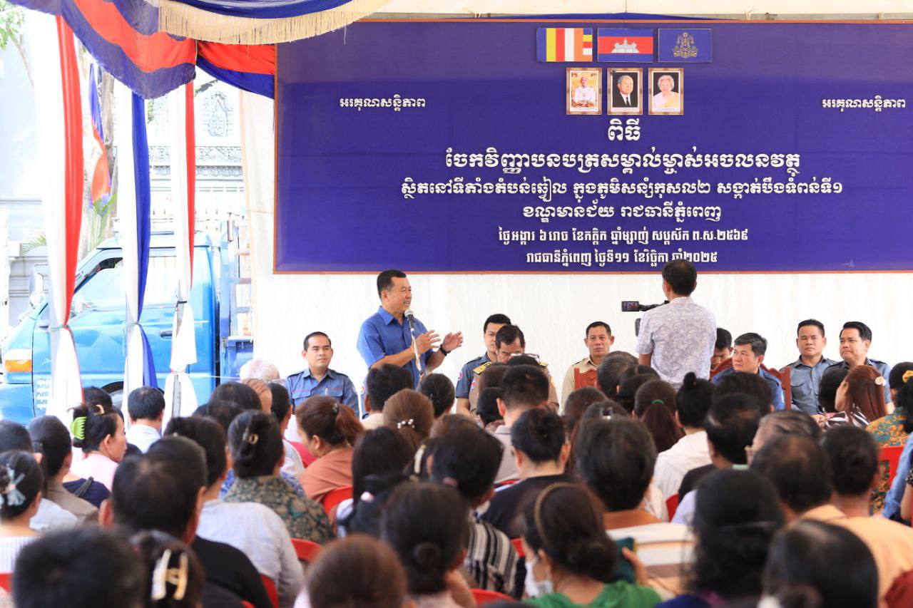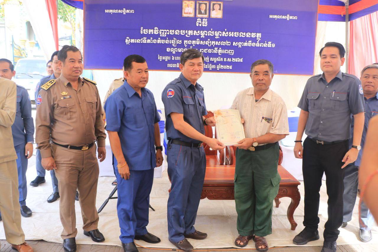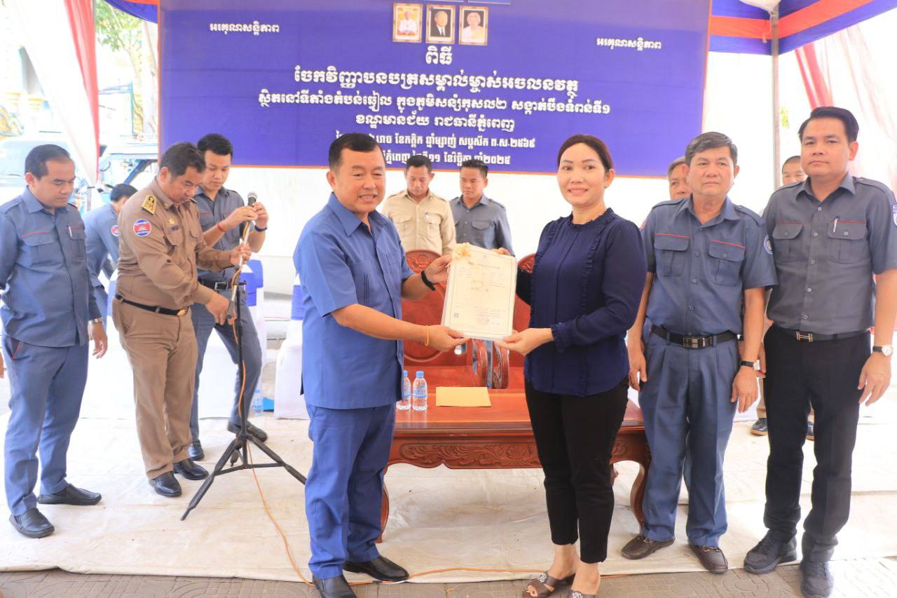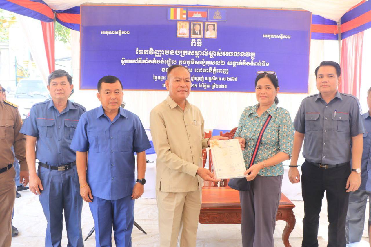 ដែលពិធីចែកប័ណ្ណកម្មសិទ្ធិដីធ្លីនេះ ធ្វើឡើងក្រោមអធិបតីភាពដ៏ខ្ពង់ខ្ពស់លោក សេង គន្ធ អភិបាល នៃគណៈអភិបាលខណ្ឌមានជ័យ និងលោក ពឹង រតនៈ អនុប្រធានមន្ទីររៀបចំដែនដីនគរូបនីយកម្មសំណង់និងសុរិយោដីរាជធានីភ្នំពេញ ដោយមានការអញ្ជើញចូលរួមពីសំណាក់អាជ្ញាធរសង្កាត់ មន្ទីរជុំវិញខណ្ណ និងប្រជាពលរដ្ឋជាច្រើនរូប នៅថ្ងៃទី១១ ខែវិច្ឆិកា ឆ្នាំ២០២៥។
