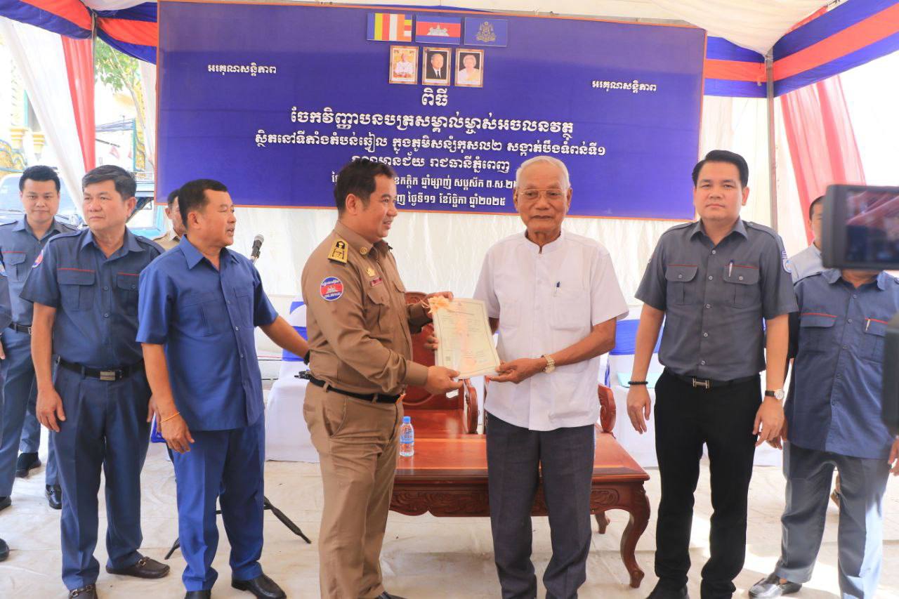 លោក សេង គន្ធ អភិបាលខណ្ណមានជ័យអញ្ជើញប្រគល់ប័ណ្ណកម្មសិទ្ធិដីធ្លីចំនួន ៣២៧ប័ណ្ណ ជូនប្រជាពលរដ្ឋចំនួន ១ភូមិ ក្នុងខណ្ណ័មានជ័យ