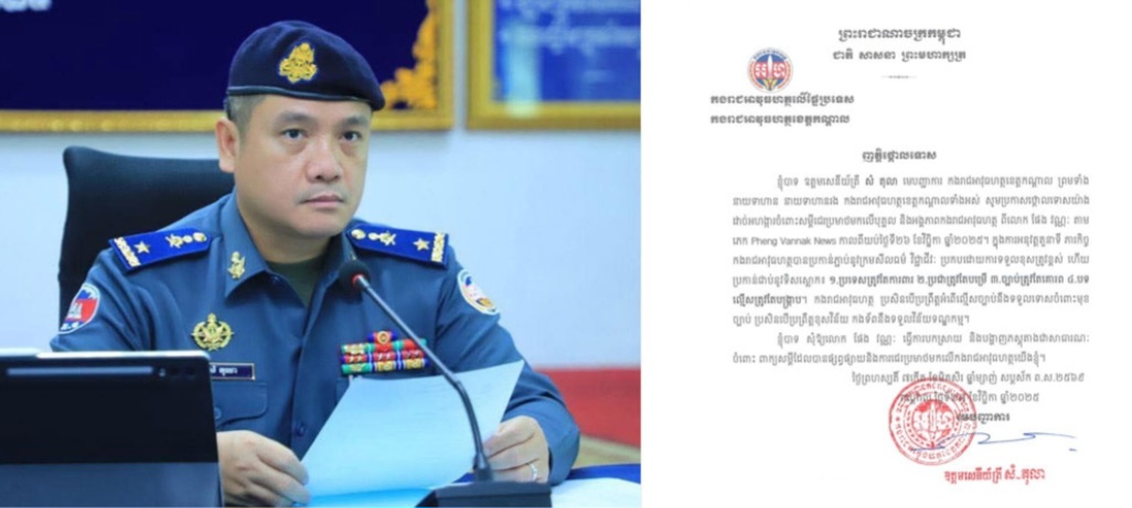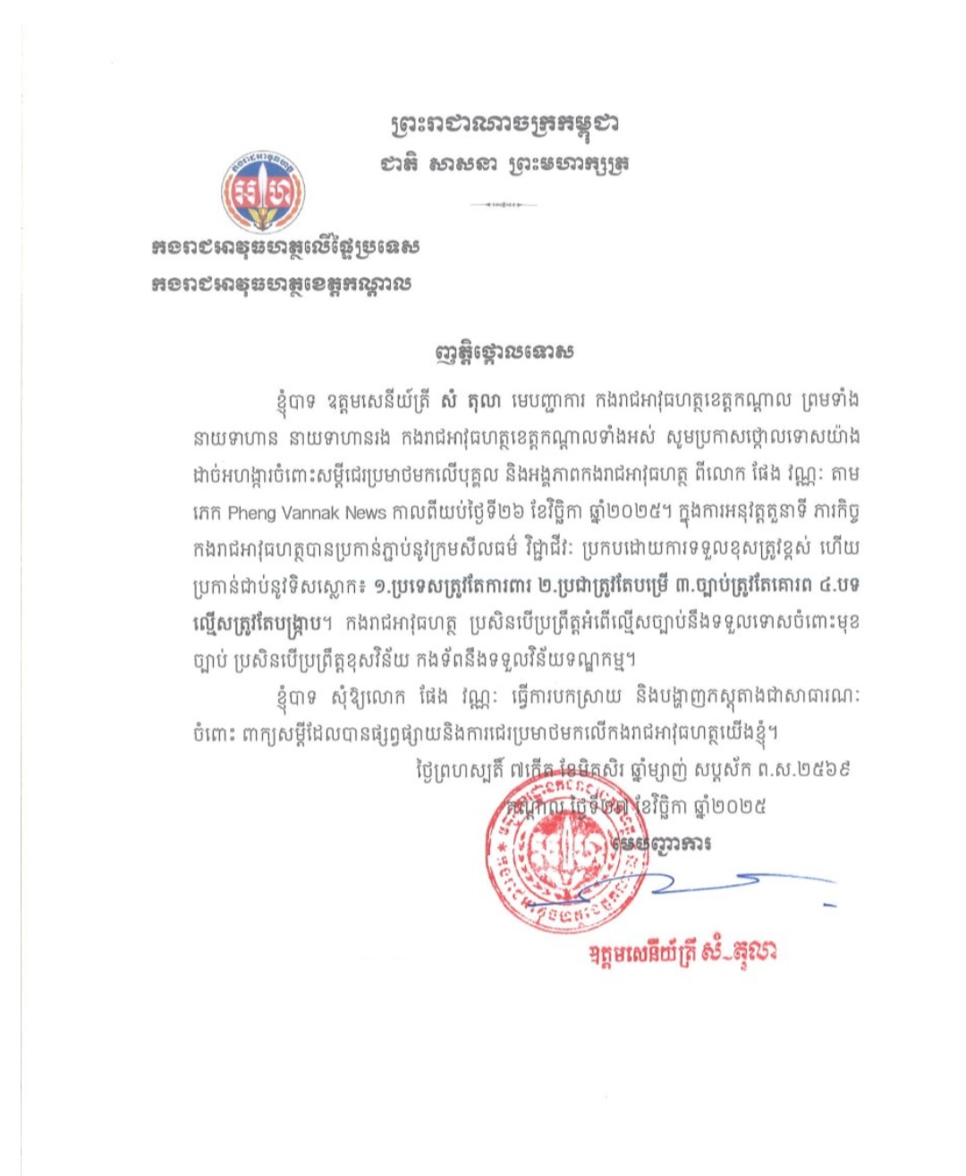 (កណ្តាល)៖ ឧត្តមសេនីយ៍ត្រី សំ តុលា មេបញ្ជាការអាវុធហត្ថខេត្តកណ្តាល ព្រមទាំងនាយទាហាន នាយទាហានរង និងពលទាហាន សូមប្រកាសថ្កោលទោសយ៉ាងដាច់អហង្ការចំពោះសម្តីជេរប្រមាថមកលើបុគ្គល និងអង្គភាពកងរាជអាវុធហត្ថពីលោក ផែង វណ្ណៈ តាមផេក «Pheng Vannak News» កាលពីយប់ថ្ងៃទី២៦ ខែវិច្ឆិកា ឆ្នាំ២០២៥។