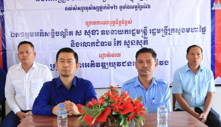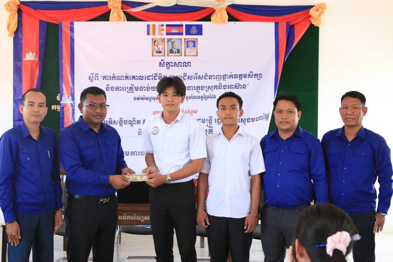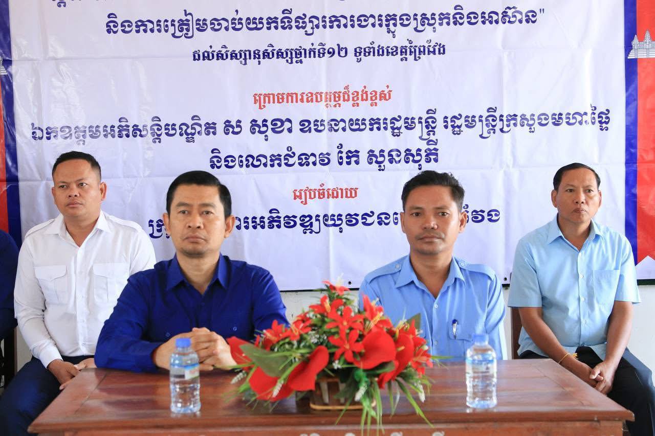 នៅព្រឹកថ្ងៃសៅរ៍ ទី២៨ ខែមីនា ឆ្នាំ២០២៦ នេះ ឯកឧត្តមបណ្ឌិត ទូច វណ្ណៈ អនុប្រធានក្រុមការងារអភិវឌ្ឍយុវជនខេត្តព្រៃវែង ជាតំណាងឯកឧត្តមបណ្ឌិត ងិន បាណាល់ ប្រធានក្រុមការងារអភិវឌ្ឍយុវជនខេត្តព្រៃវែង បានអញ្ជើញដឹកនាំក្រុមការងារ ចុះធ្វើសិក្ខាសាលាស្តីពី “ការកំណត់គោលដៅជីវិត ការជ្រើសរើសជំនាញថ្នាក់ឧត្តមសិក្សា និងការត្រៀមចាប់យកទីផ្សារការងារក្នុងស្រុកនិងអាស៊ាន” ដល់សិស្សថ្នាក់ទី១២ ចំនួន ៤៤២នាក់ នៅវិទ្យាល័យ ព្រះអង្គឌួង ស្ថិតក្នុងក្រុងព្រៃវែង ខេត្តព្រៃវែង។